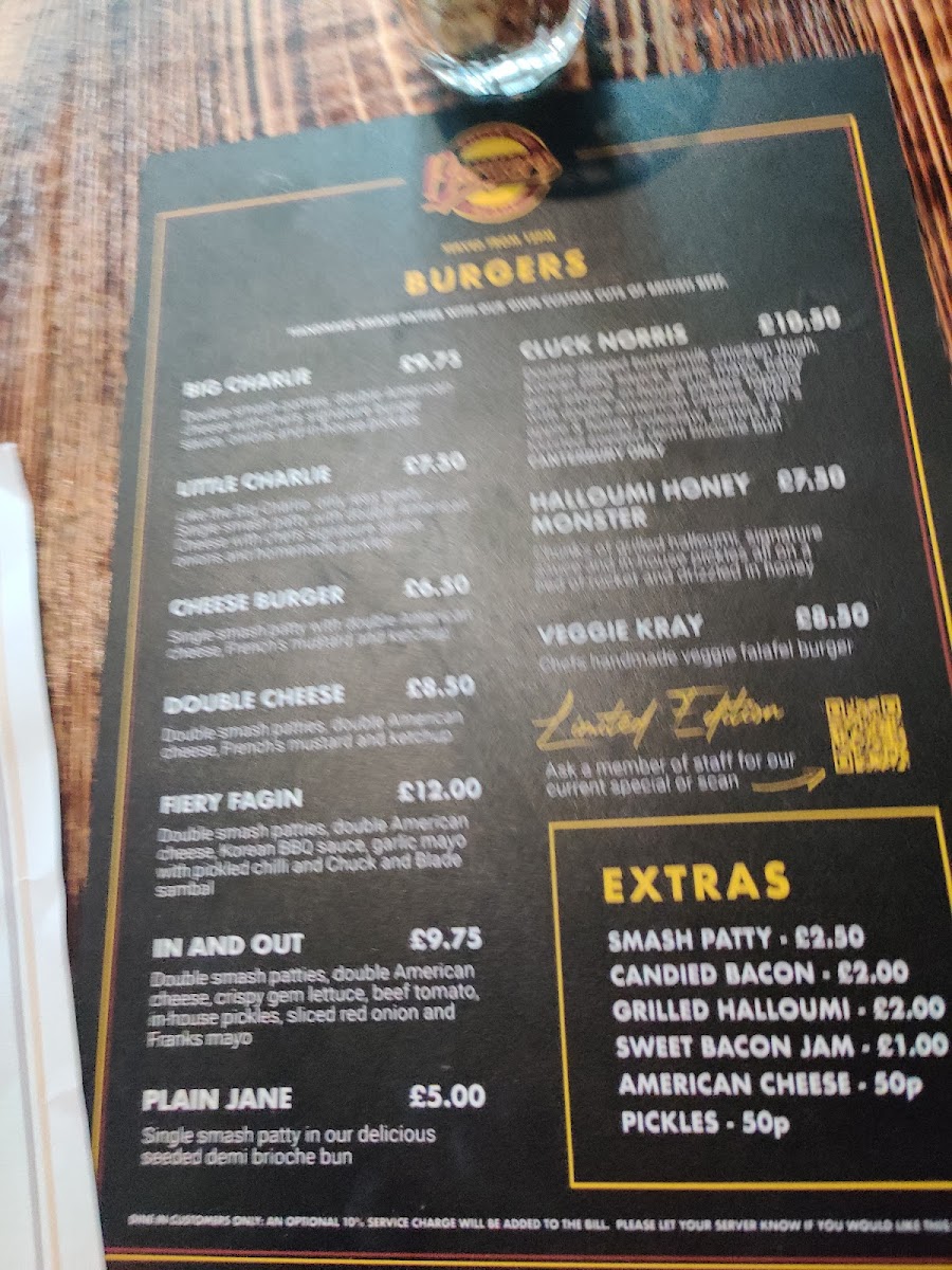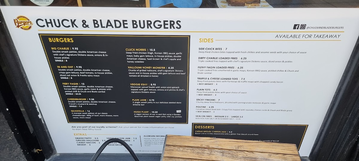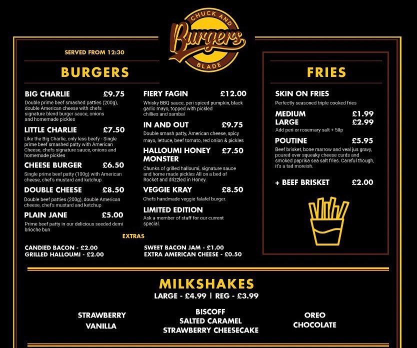 Chuck And Blade Burgers Menu, located at 25 Sun St, Canterbury CT1 2HX, offers a delightful selection of gourmet burgers that stand out in the local food scene. From classic beef patties to innovative veggie options, the menu is designed to cater to diverse tastes. The emphasis on quality ingredients shines through with each bite, ensuring a satisfying meal.